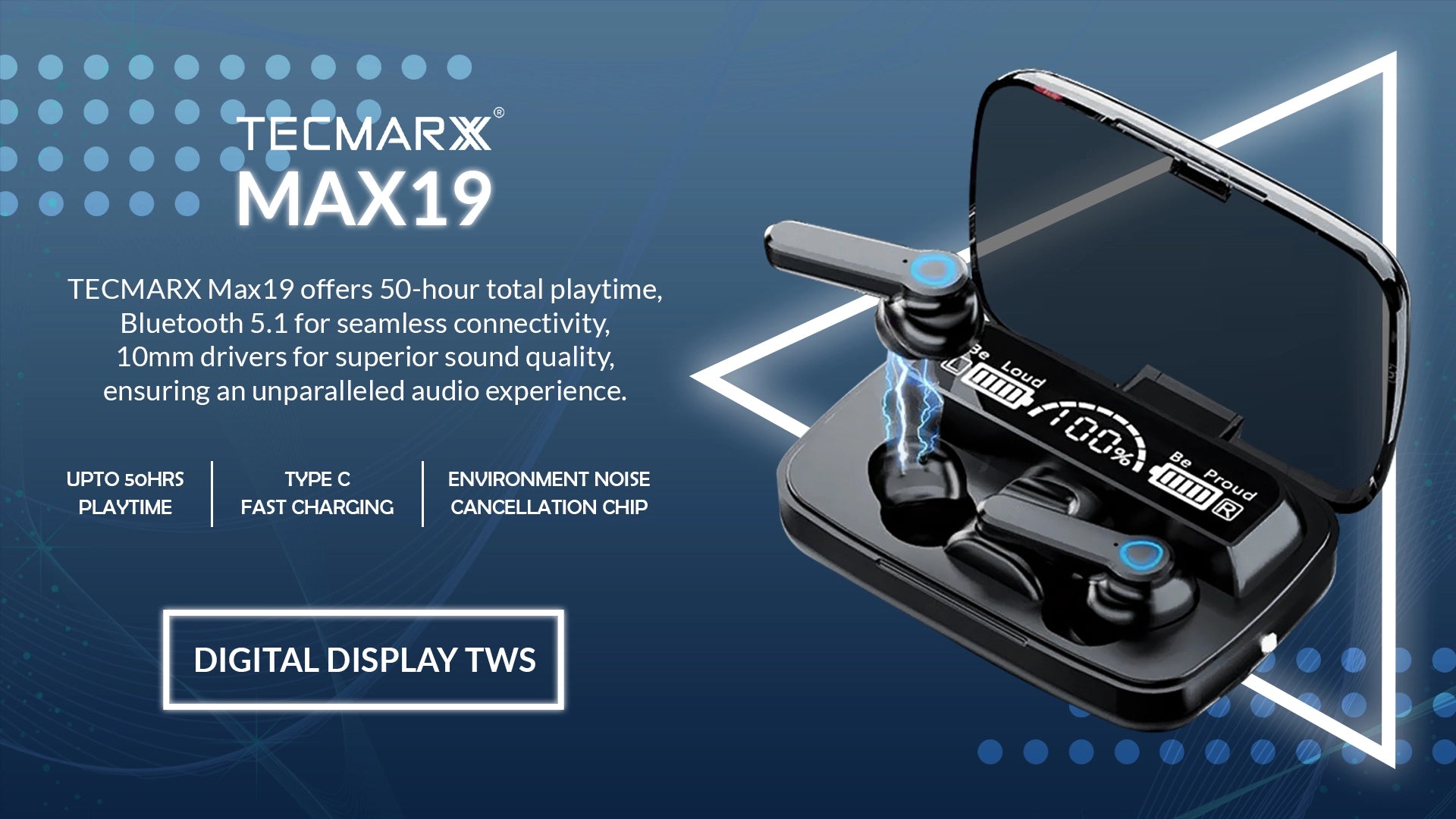 Introducing the TecMarx Max 19 Bluetooth Earbuds: Elevate your audio experience with these cutting-edge earbuds that seamlessly blend performance, convenience, and style.