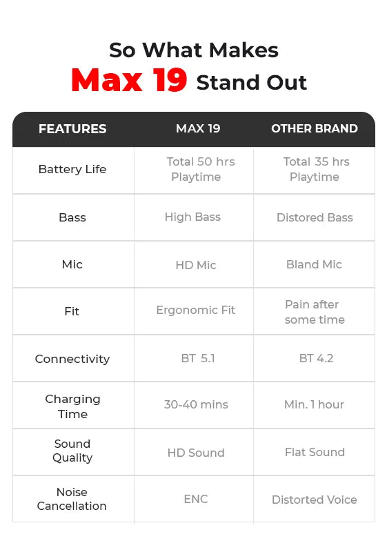 10-Hour Playtime: Uninterrupted music, calls, and podcasts for days! The Max 19’s extended battery life ensures you stay connected wherever you go.