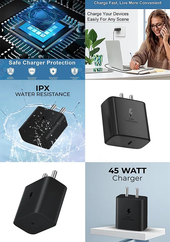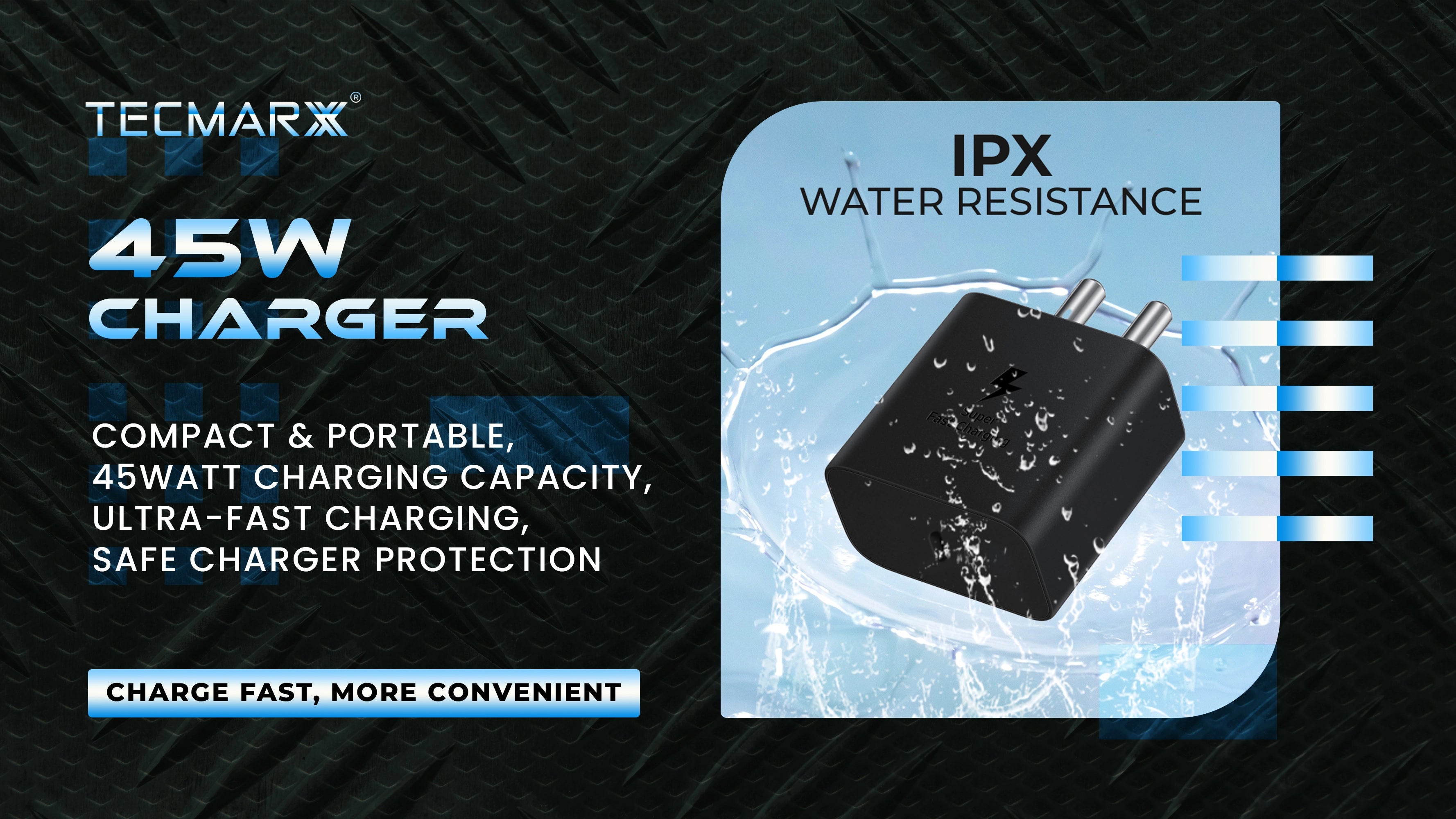 TecMarx 45W Charger offers super-fast charging for all your devices. With a Type C interface and IPX water resistance, it's perfect for home, office, and travel. Charge your smartphones, tablets, and laptops safely and efficiently with advanced protection features. Choose TecMarx for reliable, quick, and safe power delivery.