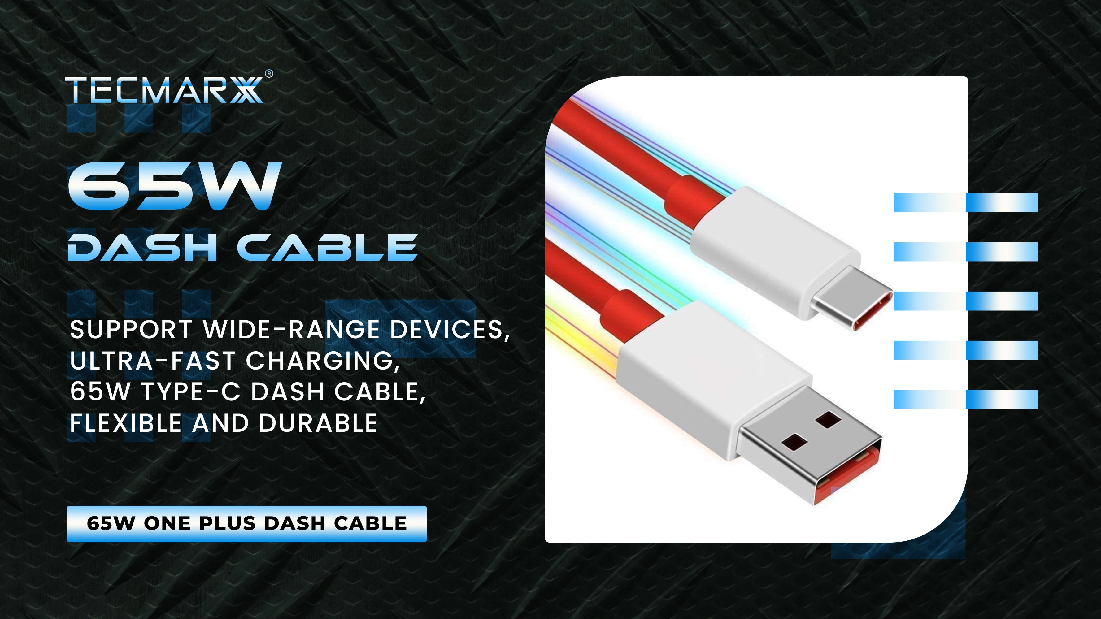 TECMARX Dash/Warp support cable with high speed data transfer technology. This cable can support all One Plus, Oppo, Vivo, Mi Turbo Chargers.