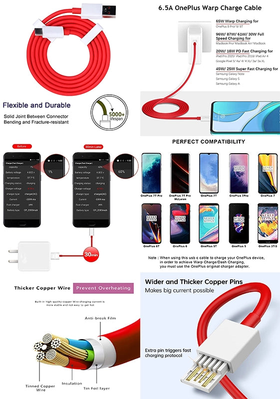 65 Watt One Plus Support Cable. Supports Dash, Warp, Mi Turbo, Vivo and Oppo Chargers