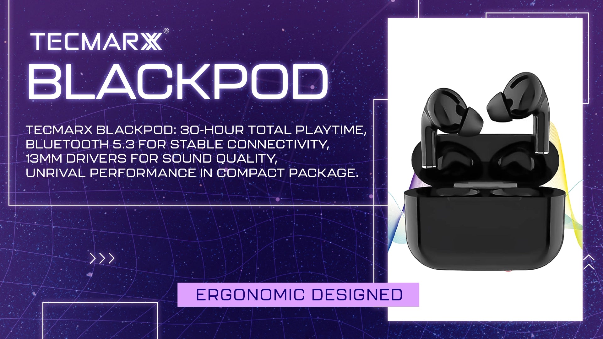 Elevate your audio experience with the TecMarx Black Pod Bluetooth Earbuds. Combining high bass, long battery life, and water resistance, these earbuds are the perfect companion for all your music needs.