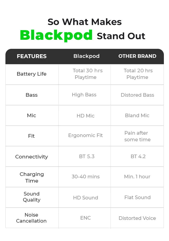 Discover unmatched audio quality with TecMarx Black Pod Bluetooth Earbuds. Designed for music lovers, these earbuds deliver high bass that brings your favorite tracks to life with rich, immersive sound. With an impressive 40-hour battery life, you can enjoy long listening sessions without constantly recharging, making them perfect for travel, workouts, and daily commutes.
