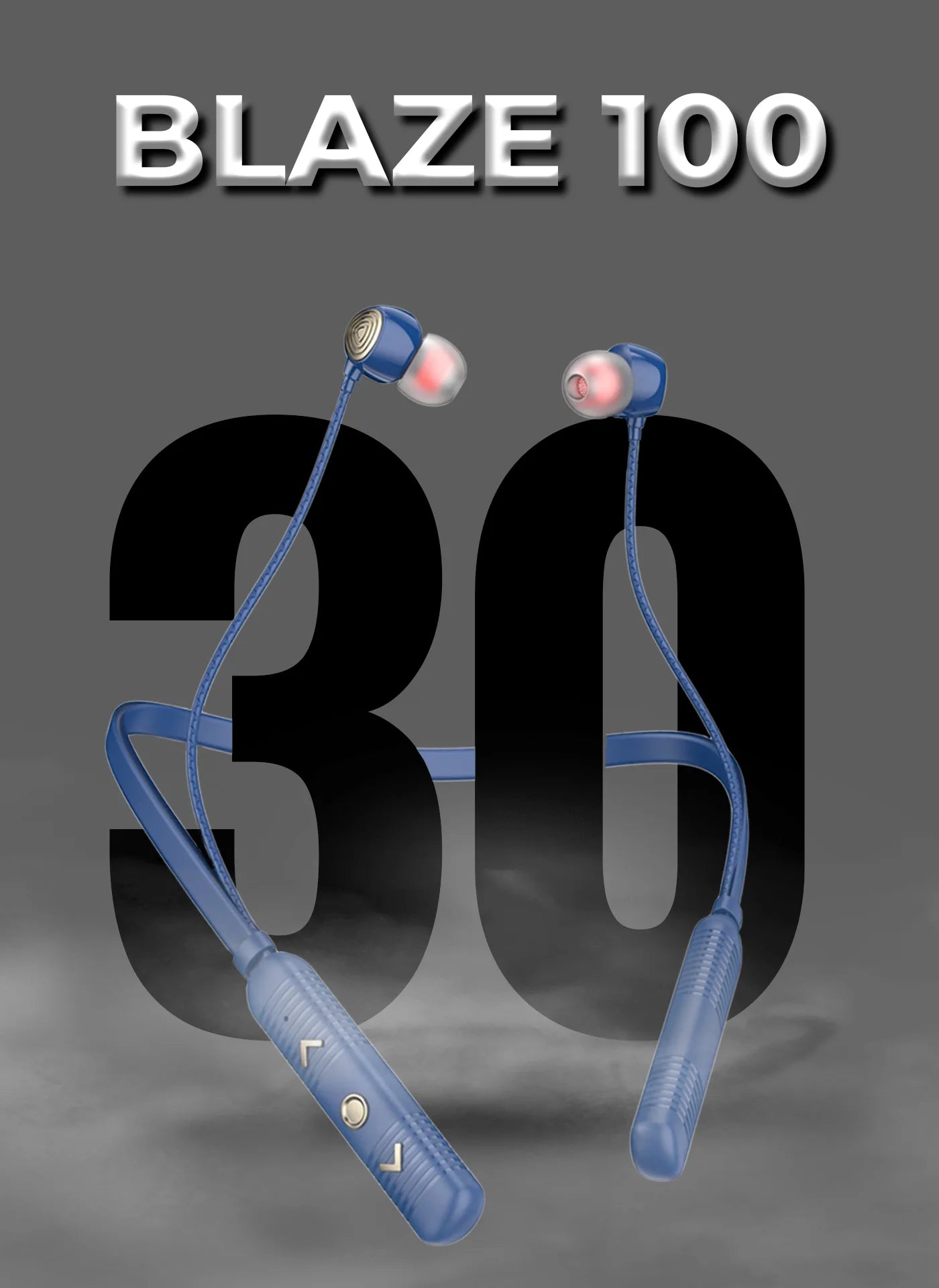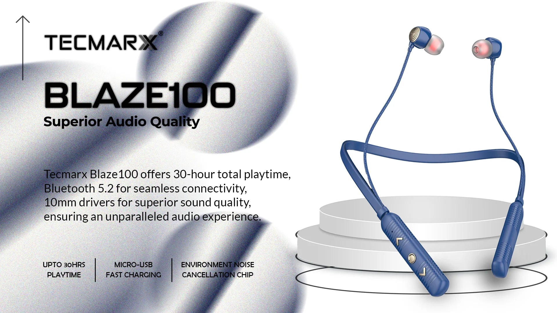 TecMarx BLAZE100 Bluetooth Neckband | 30 Hr Playtime | Balanced Sound | IPX Water Resistant: Enjoy 30 hours of balanced sound with the TecMarx BLAZE100 Bluetooth Neckband. Perfect for music lovers, this neckband offers crystal-clear audio and deep bass. Designed for durability, it's IPX water-resistant, making it ideal for workouts and daily use. Stay connected with TecMarx's reliable performance.