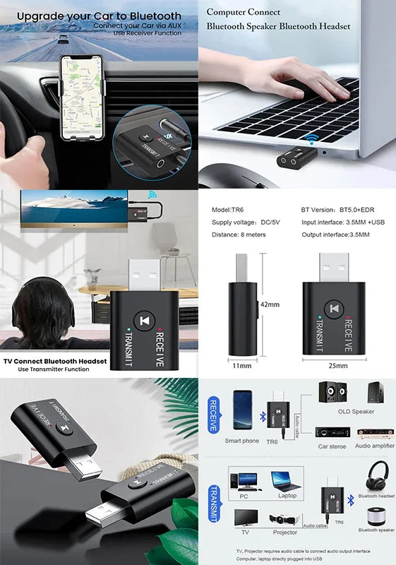 Experience seamless audio streaming with the TecMarx BT620 4 in 1 Bluetooth 5.0 Transmitter. This portable wireless USB device is designed to enhance your entertainment by enabling hassle-free audio transmission across all your smart gadgets. With Bluetooth 5.0 technology, enjoy faster, more stable connections with minimal latency, making it ideal for watching TV, gaming, or streaming music. The BT620 is versatile, supporting transmitter and receiver modes, offering compatibility with a wide range of devices like smartphones, tablets, laptops, and even car audio systems. Its compact, travel-friendly design ensures portability, so you can enjoy premium-quality sound anywhere. Whether you're upgrading your home entertainment or seeking reliable wireless audio on the go, the TecMarx BT620 is the perfect companion.