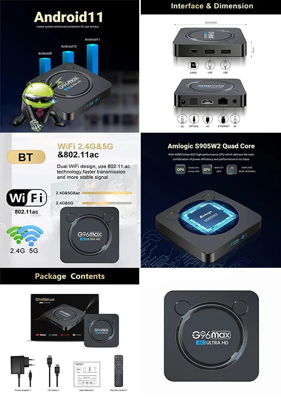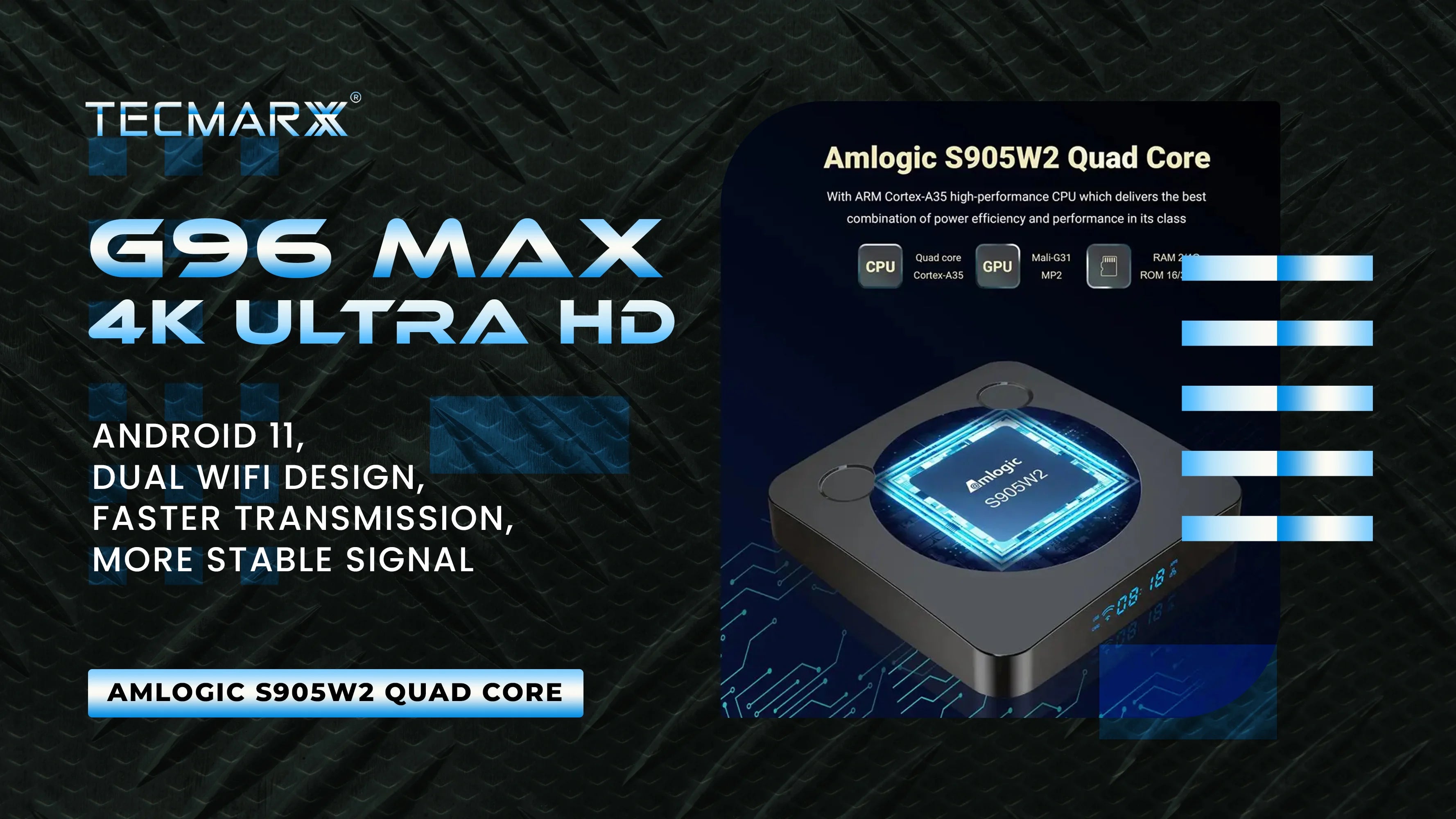 Upgrade your entertainment with the TecMarx G96 4K Android TV Box. Powered by Android 11 and the Amlogic S905W2 Quad Core processor, enjoy seamless streaming in stunning 4K. Access all your favorite apps with ease and experience lightning-fast performance for movies, games, and more.