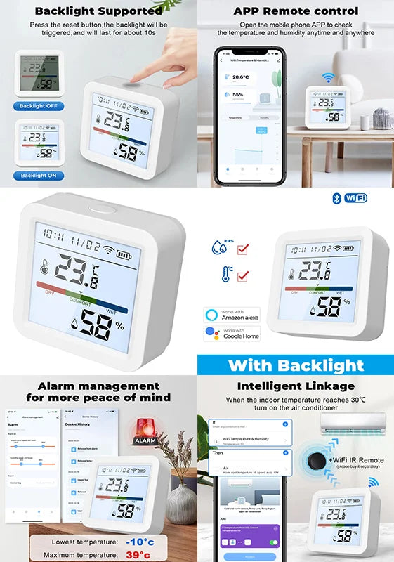 The TecMarx Humidity & Temperature Sensor is designed to provide seamless control over your home's environment. Equipped with advanced Wi-Fi connectivity, it allows real-time monitoring of temperature and humidity levels from your smartphone, no matter where you are. Its compatibility with Home Assistant makes it easy to integrate with your smart home ecosystem, offering a centralized way to manage your devices. Voice control support through Google Assistant and Amazon Alexa adds convenience, allowing you to adjust settings hands-free.
