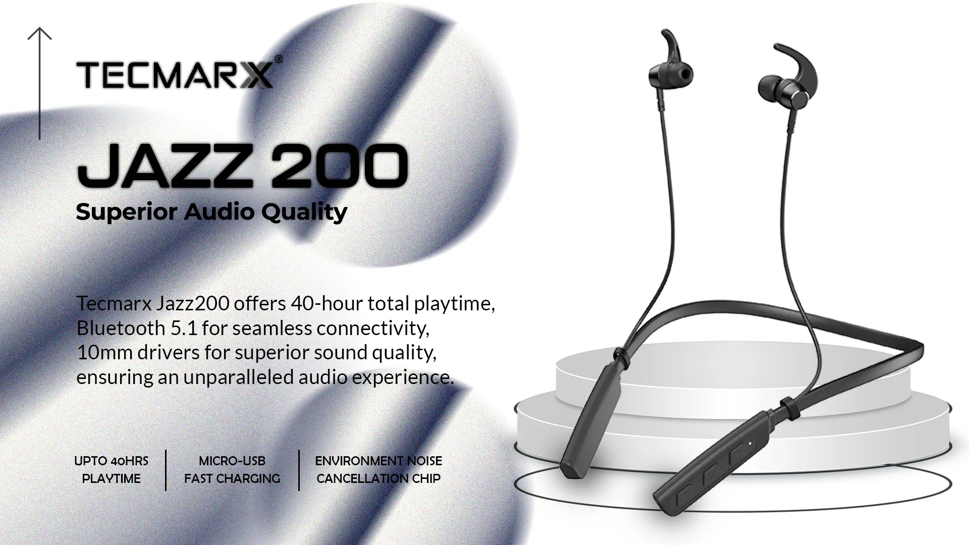 TecMarx Jazz 200 Bluetooth Neckband | 40 Hr Playtime | Powerful Bass | IPX Water Resistant: Experience powerful bass and all-day comfort with TecMarx Jazz 200 Bluetooth Neckband. Enjoy up to 40 hours of playtime, perfect for long listening sessions. Designed with IPX water resistance, it's ideal for workouts or daily use. Stay connected and enjoy superior sound quality with TecMarx.