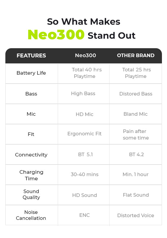- Deep Bass Delight: Feel the pulse of every track with our signature deep bass. From heart-thumping beats to soulful melodies, the Neo 300 elevates your music to a whole new level.