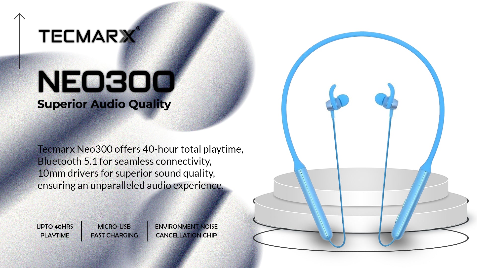 Introducing TecMarx Neo 300 Bluetooth Neckband, your perfect music companion. With an impressive 40-hour battery life, enjoy deep bass and immersive sound quality. Plus, its IPX water resistance ensures durability. Elevate your audio experience with TecMarx Neo 300.