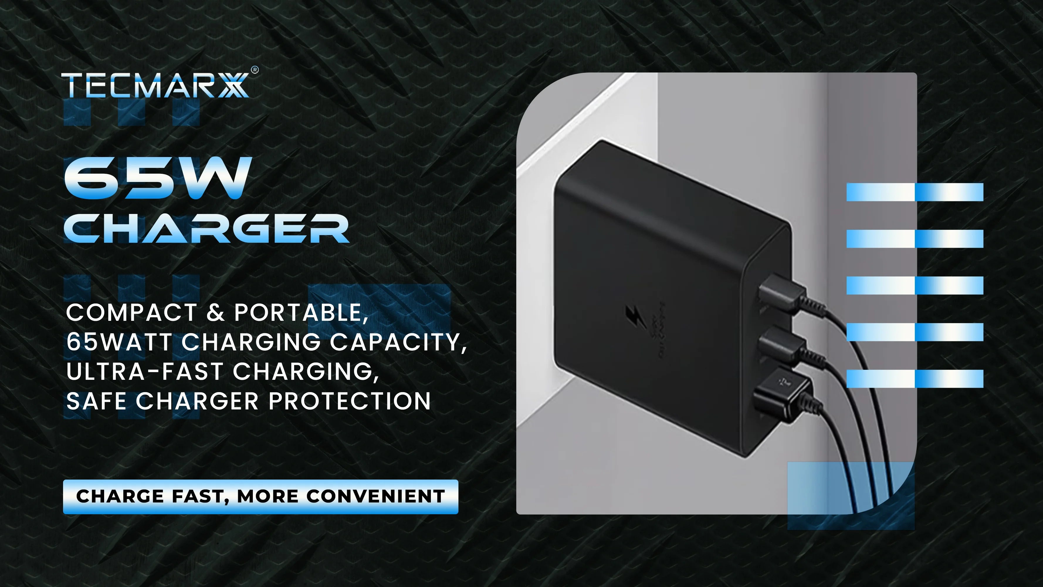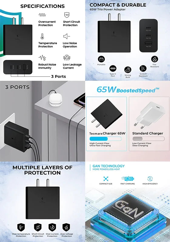 TECMARX PD Charger || 65 Watt Output || With 65W Type C to C Cable | Supports Samsung, OPPO, Vivo, Xioami