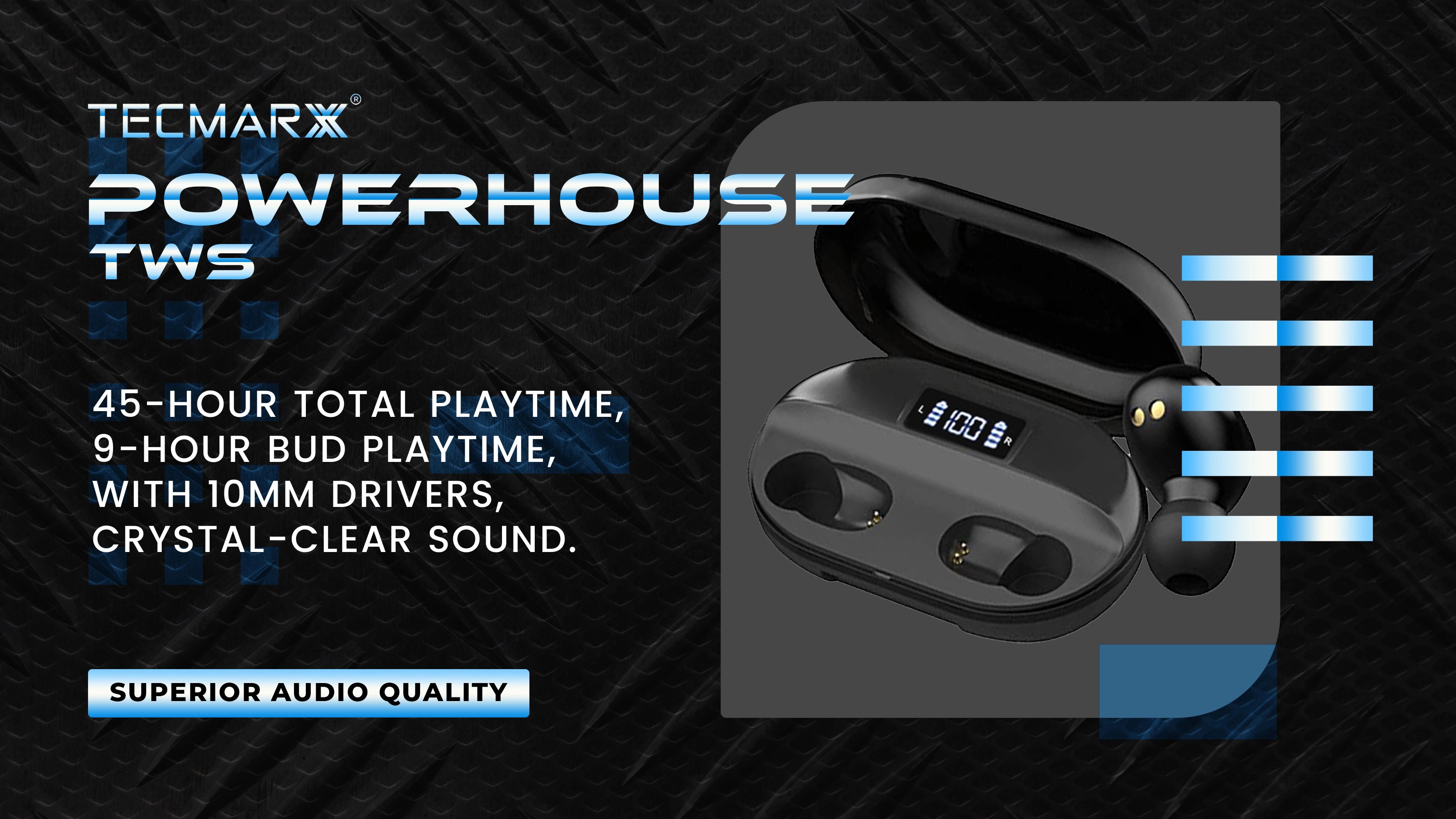 TecMarx Power House Earbuds: Fuel your day! Enjoy 45 hours of balanced sound, plus an instant power bank. IPX water-resistant and ultra-comfortable. Never run out of power again. TecMarx earbuds wireless earbuds powerbank earbuds
