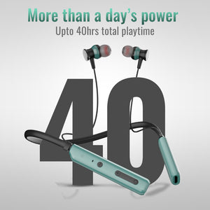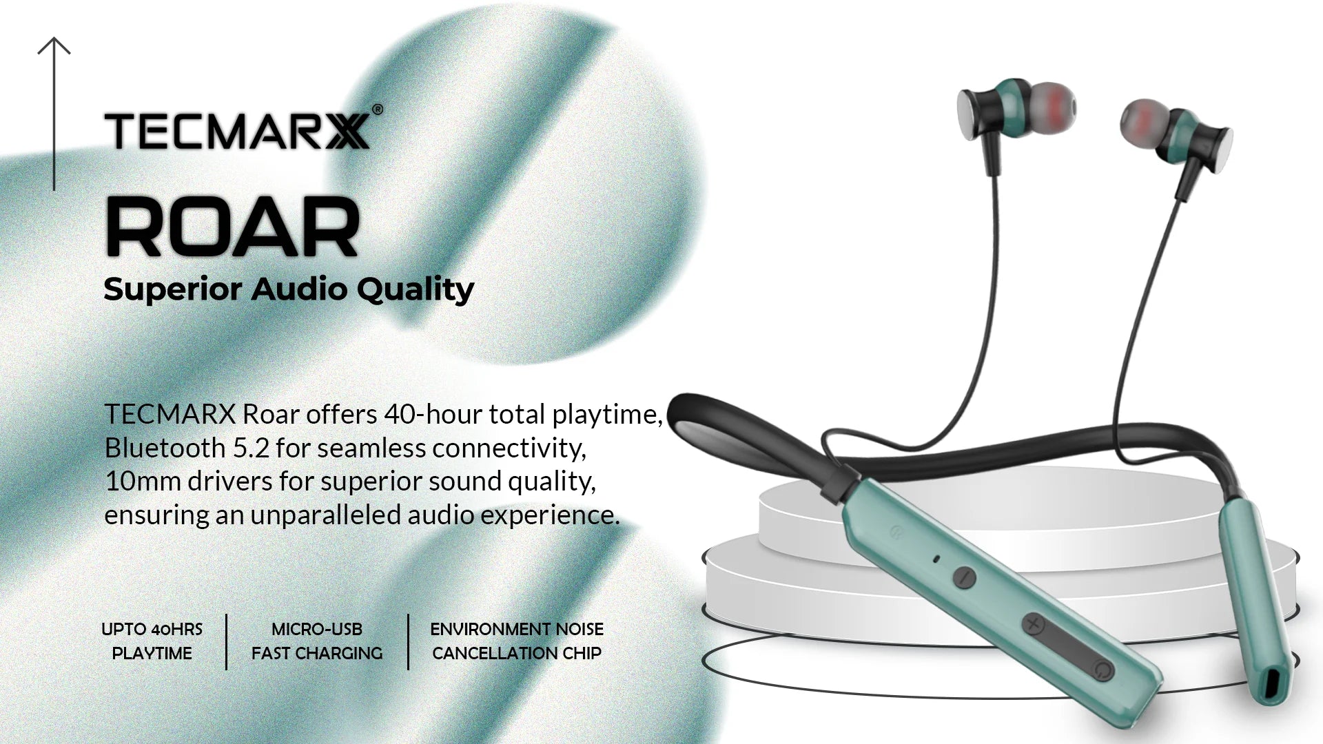TecMarx Roar Neckband: Immerse yourself in sound! Enjoy 40 hours of playtime with powerful 14mm drivers and ENC for crystal-clear calls. IPX5 water resistance and comfortable fit make it perfect for workouts and daily use. TecMarx neckband bluetooth neckband