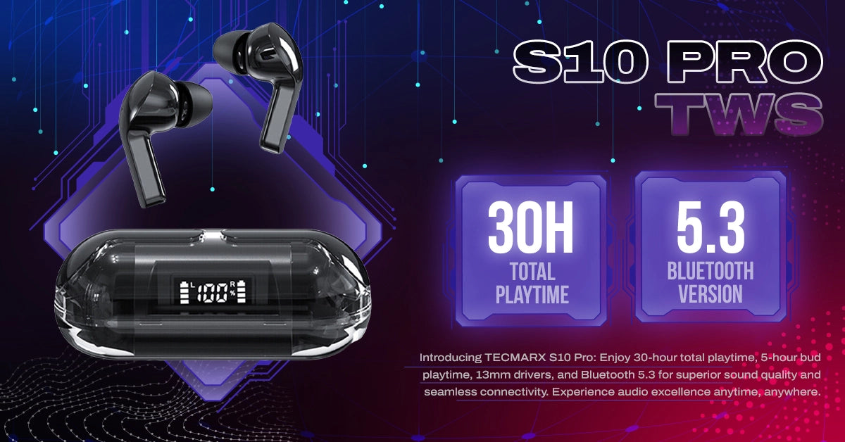Discover the pinnacle of audio technology with TecMarx S10 Pro Bluetooth Earbuds. Enjoy 30 hours of balanced sound and IPX water resistance, ensuring durability in any environment. Elevate your music experience with these premium earbuds.