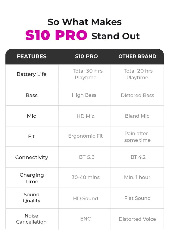 - 30 Hours of Nonstop Playback: Whether you’re on a marathon call or grooving to your favorite tunes, the S10 Pro keeps the beats alive with an impressive 30-hour battery life.