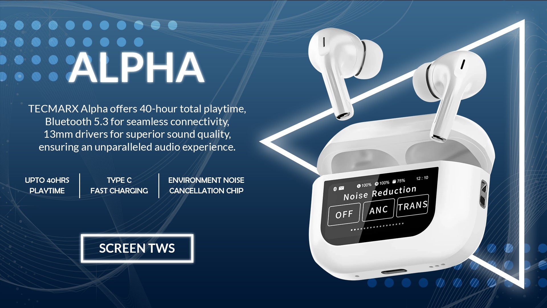 Introducing TecMarx Alpha Smart Display TWS Bluetooth Earbuds: Elevate your audio experience with 40 hours of playtime, powerful bass, and IPX water resistance. Stay connected with the numeric indicator and enjoy seamless sound with our advanced technology. Upgrade to TecMarx Alpha today!