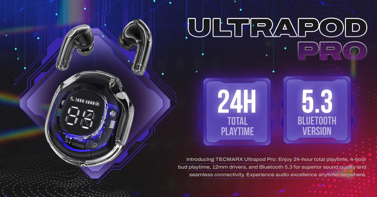 Elevate your music experience with TecMarx UltraPod Pro Bluetooth Earbuds. Offering 25 hours of balanced audio and IPX water resistance, they're perfect for all-day use. Immerse yourself in premium sound quality and durability.