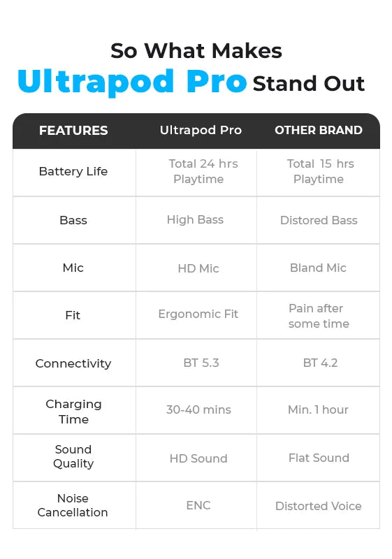 - 25 Hours of Nonstop Playback: Whether you’re on a marathon call or grooving to your favorite tunes, the UltraPod Pro keeps the beats alive with an impressive 25-hour battery life.