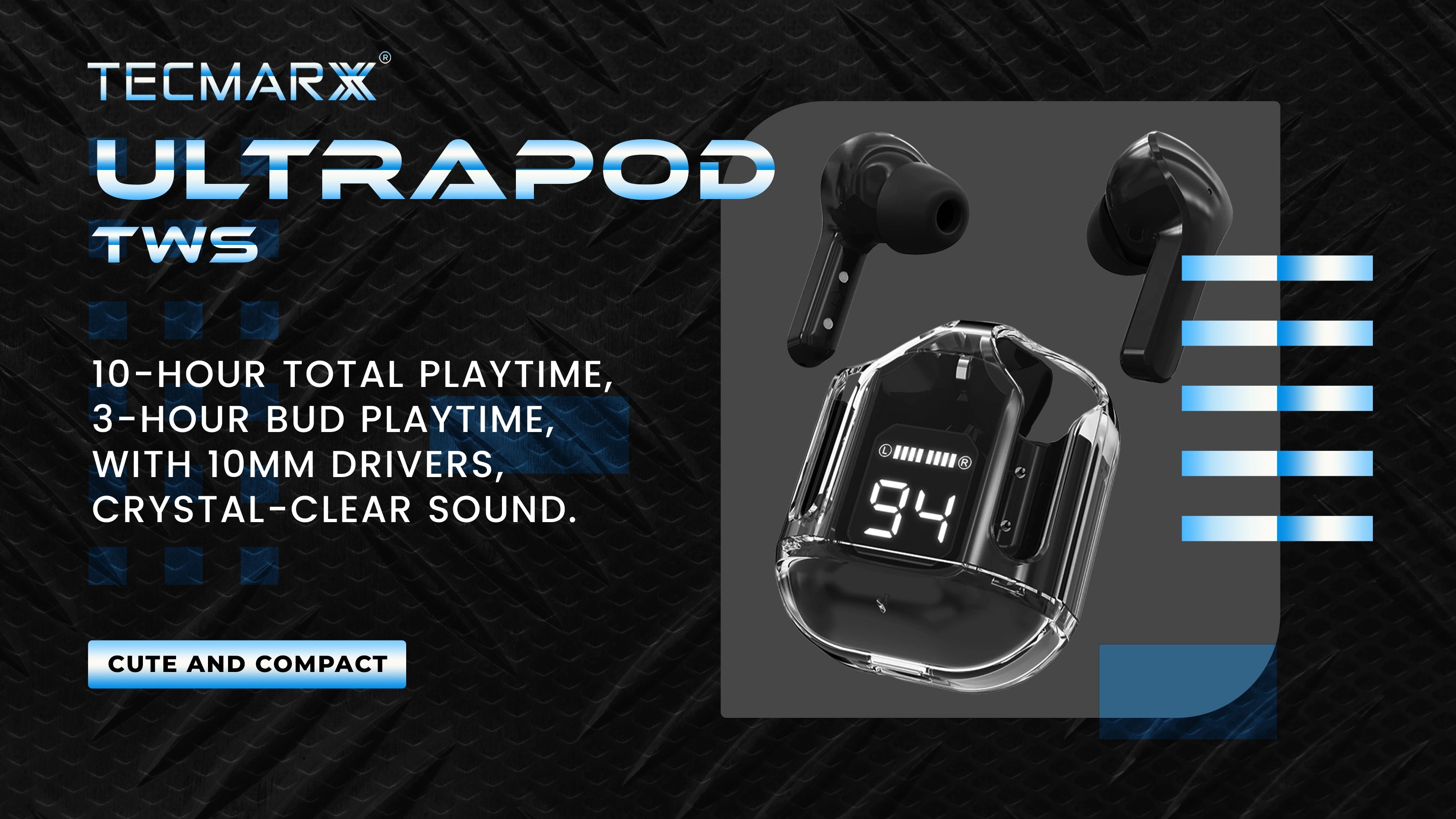 TECMARX UltraPods True Wireless Earbuds | 30 Hr Playtime | IPX Water Resistant | HD Bass