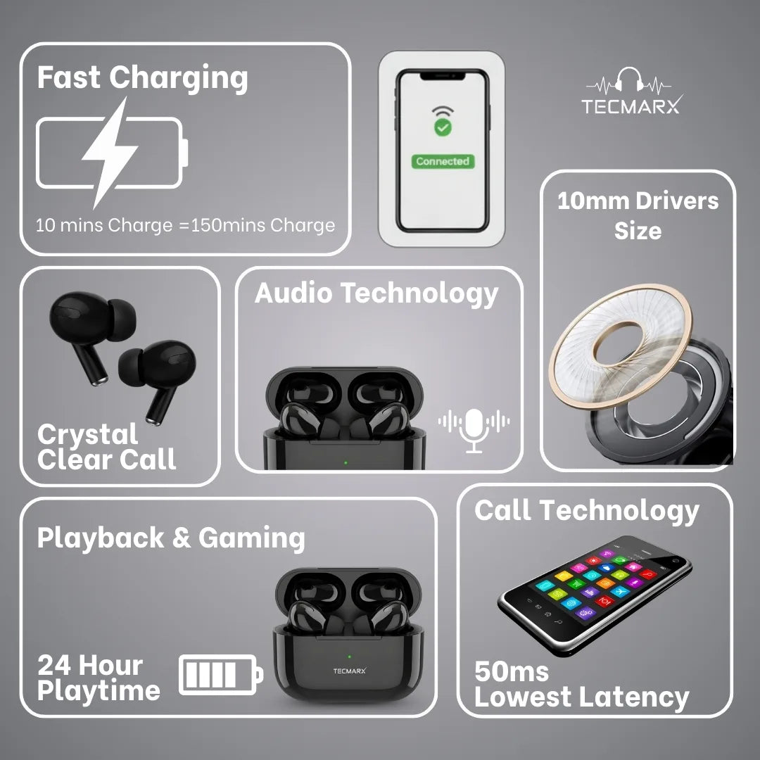 TecMarx NeoPod Bluetooth Earbuds | 24 Hr Playtime | Balance Sound | IPX Water Resistant